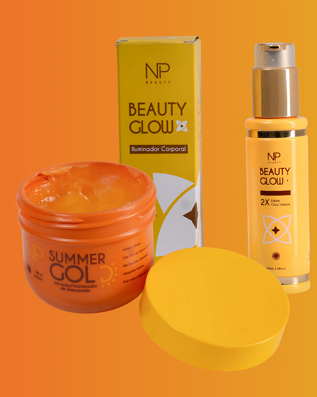O Kit Bronze & Glow NP Beauty une dois dos nossos queridinhos: o *Summer Gold*, bronzeador com ação hidratante e aceleradora de melanina, e o *Beauty Glow*, iluminador corporal com acabamento natural, que valoriza sua pele com um toque de brilho e sedosidade.